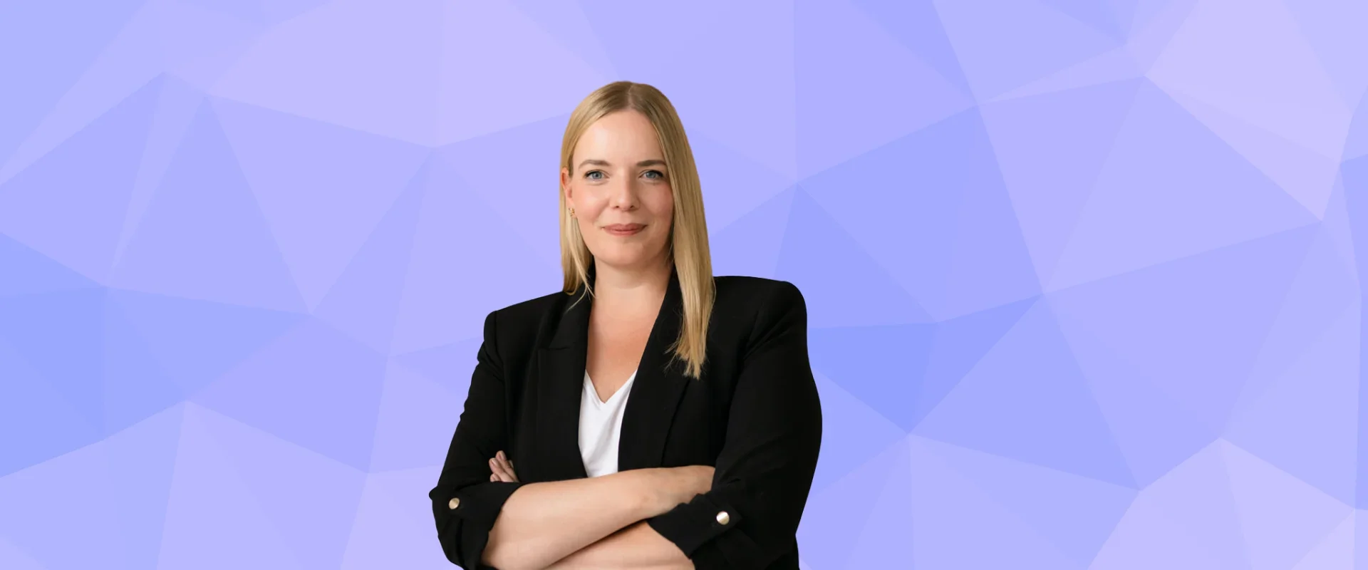 Junge blonde Frau mit blauen Augen, die eine Hand unter das Kinn stützt, vor hellem Hintergrund, trägt schwarze Jacke.
